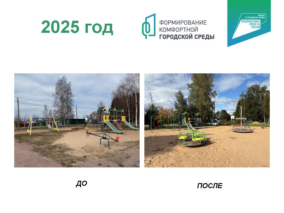 1. с. Видлица, ул. Советская «Зона семейного отдыха» (3 этап). Выполнены работы по ремонту основания (планировка, установка бордюров, отсыпка песком). Приобретено и установлено новое детское игровое оборудование. Общая стоимость выполненных работ: 1 148 712,14 руб. (ФБ – 1 072 853,79 р.; РК – 10 836,90 р.; МО – 65 021,44 р.)