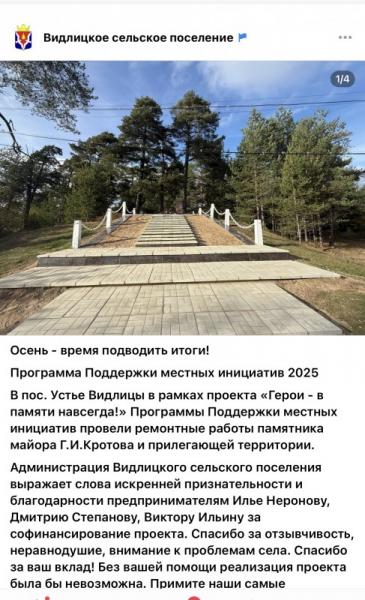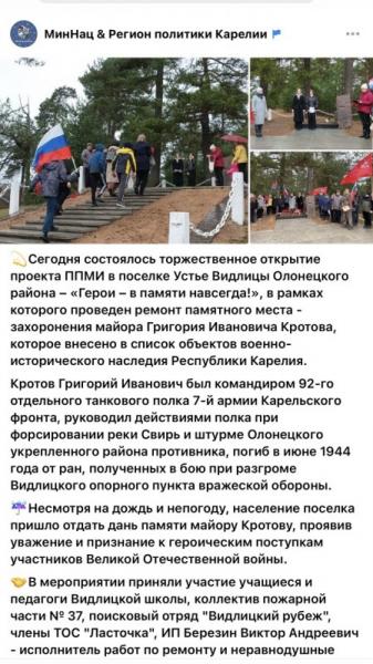 2. В поселке Устье Видлицы реализован проект – «Герои – в памяти навсегда!», в рамках которого проведен ремонт памятного места - захоронения майора Григория Ивановича Кротова, которое внесено в список объектов военно-исторического наследия Республики Карелия.