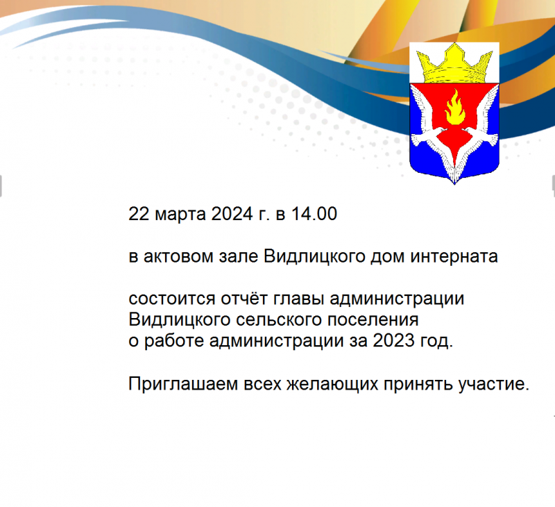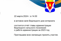 22 марта 2024 г. в 14.00 в актовом зале Видлицкого дом интерната состоится отчёт главы администрации Видлицкого сельского поселения о работе администрации за 2023 год.